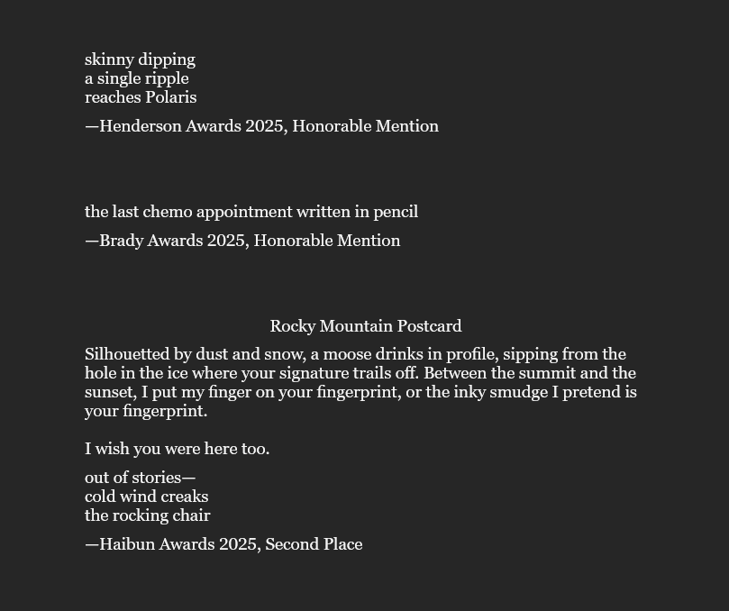 Wow! Thanks to the judges of the Henderson Awards, Brady Awards, and Haibun Awards, and thank you to the wonderful officers of the Haiku Society of America!